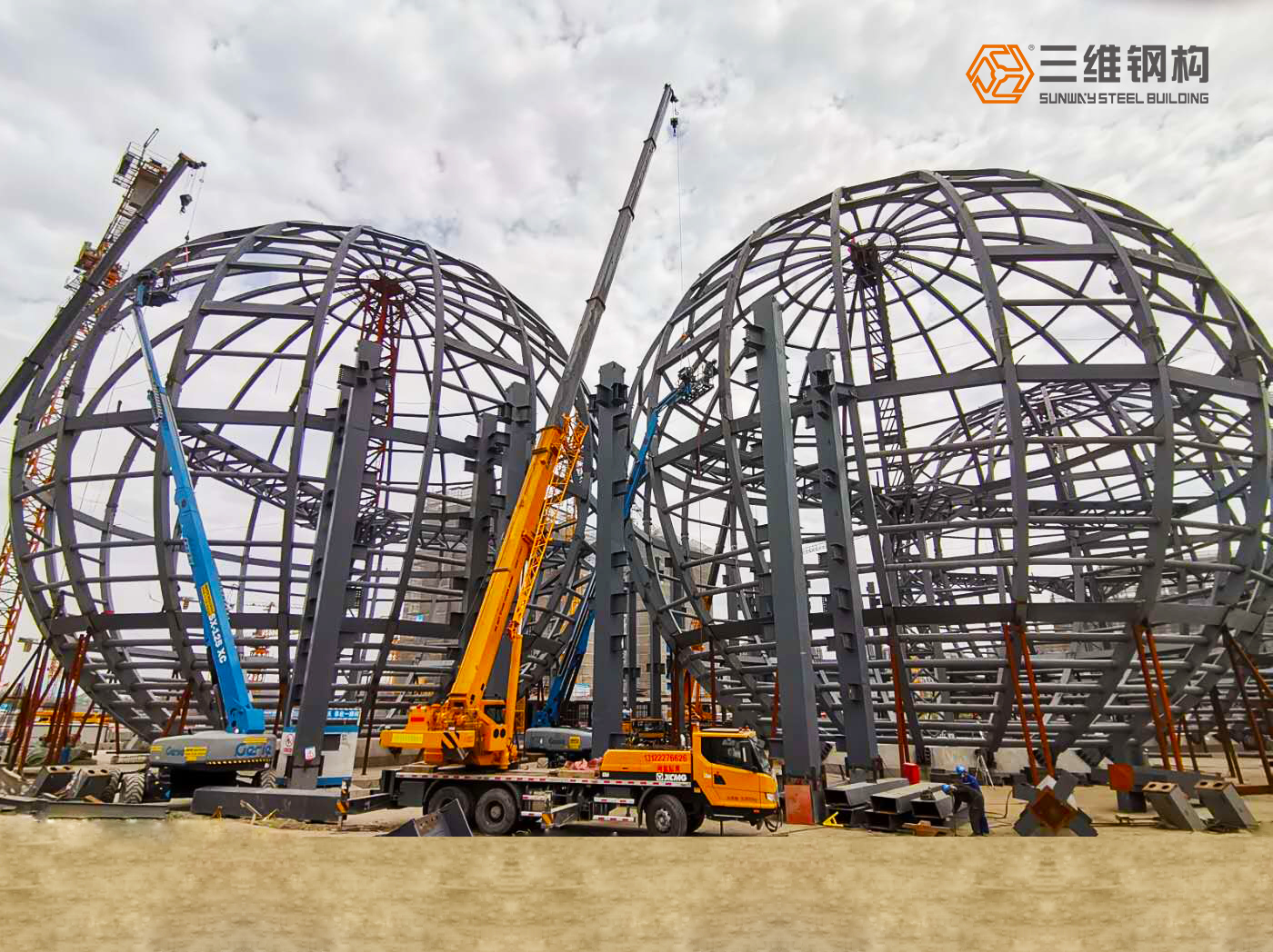 原來這三個大鐵球是由三維鋼構(gòu)參與建造的第四代全新科技體驗館項目,建成以后,將成為世界首創(chuàng)的同時擁有三個直徑40米的720度球幕高科技體驗館。