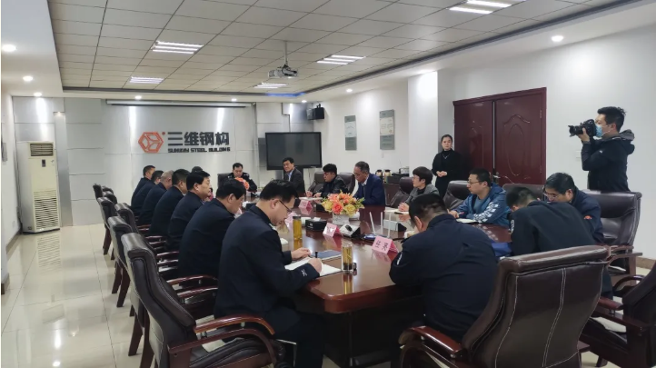 3月27日,棗莊市公安局副局長田傳海,滕州市副市長、滕州市公安局局長杜茂廣一行蒞臨我司調(diào)研指導(dǎo)企業(yè)社會(huì)治安工作。三維鋼構(gòu)董事長、書記等陪同接待。