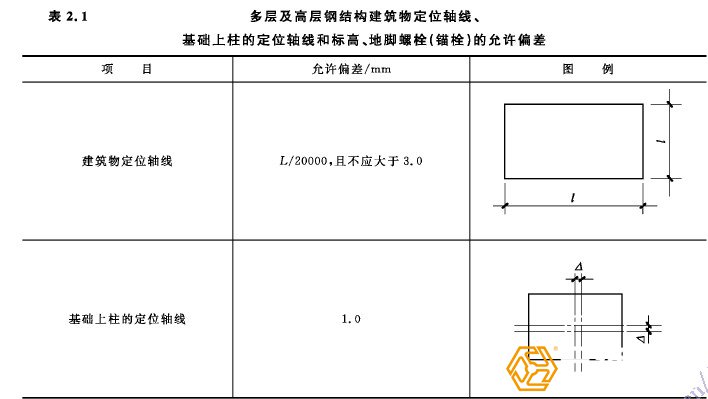 第11. 2. 1條建筑物的定位軸線、基礎(chǔ)上柱的定位軸線和標高、地腳螺檢(描栓)的規(guī)格和位置、地腳螺栓(描栓)緊固應(yīng)符合設(shè)計要求。當設(shè)計無要求時,應(yīng)符合表2. 1的規(guī)定(單層廠房鋼結(jié)構(gòu)工程可參考執(zhí)行)。